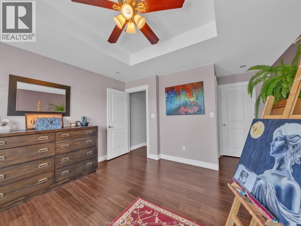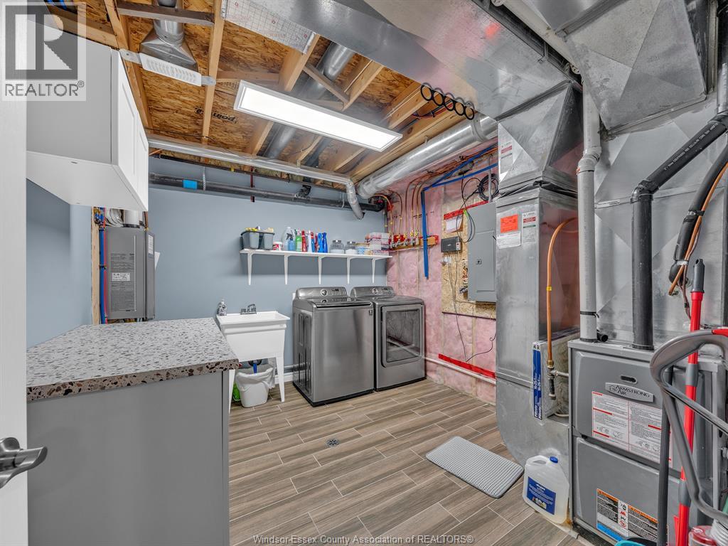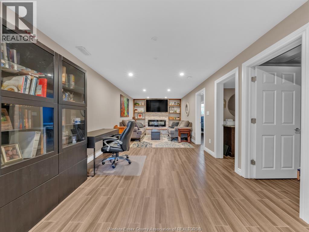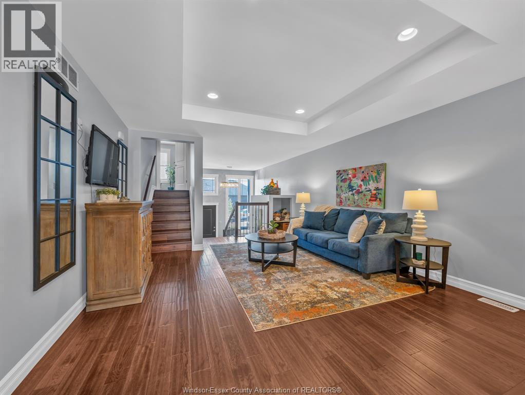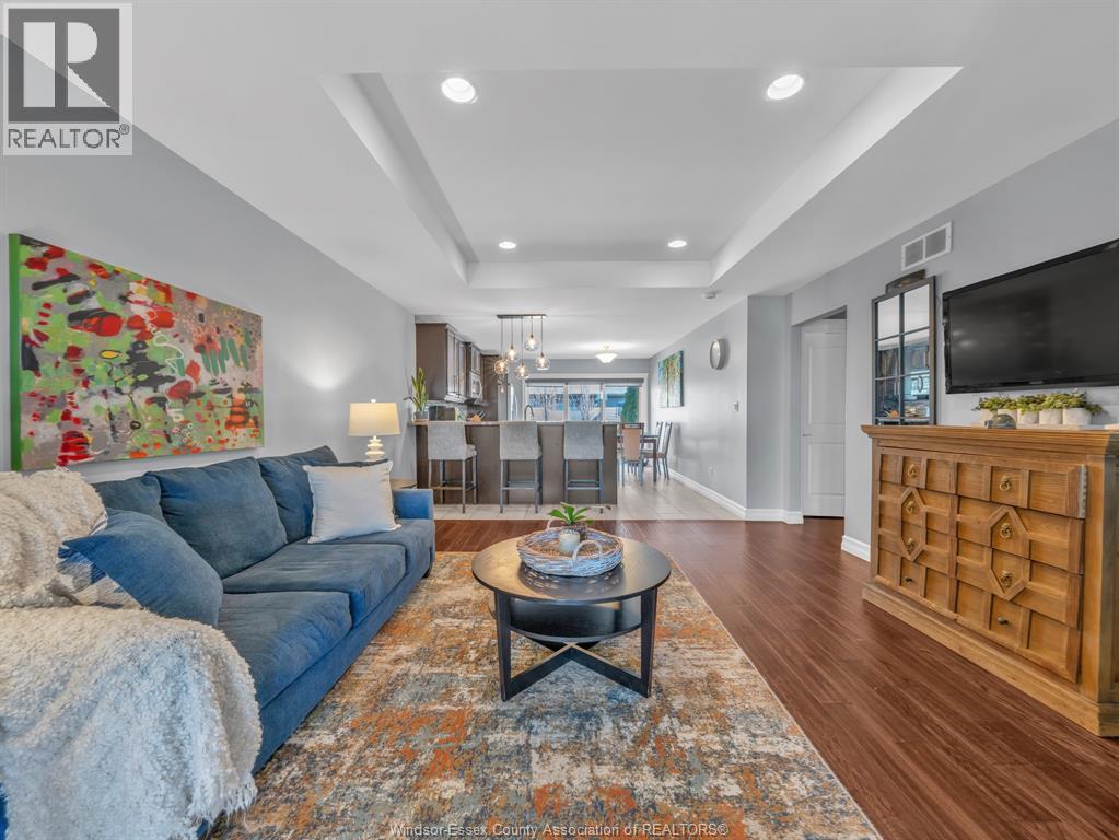 Stylish raised ranch townhouse offering modern, open-concept living in a prime location! The main floor features a bright layout with a functional kitchen complete with ceramic flooring, seamlessly connected to the living and dining areas by a sleek countertop bar. Engineered hardwood flows throughout the main space and into the impressive bonus room above the garage, which includes a private ensuite and walkin closet. The fully finished lower level boasts an open-concept design with ceramic tile flooring that mimics hardwood, along with a striking fireplace set against a custom brick and stone feature wall. This level also offers an additional bedroom and a recently renovated laundry room. The entire home has been freshly painted within the last year and includes a full bathroom on every level for added convenience. Enjoy a rare, tree-lined backyard providing exceptional privacy. Ideally situated on the edge of Tecumseh, just steps from Blue Heron Pond, Tecumseh Arena , and nearby walking trails, this home offers the perfect blend of comfort, style, and location (id:4555)